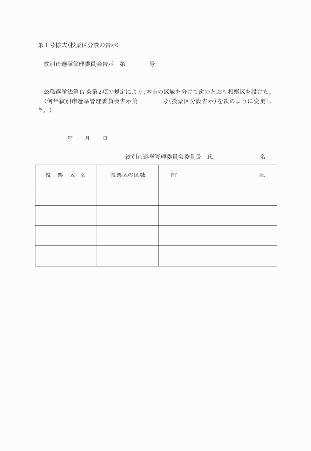 第4条 法第17条第3項((投票区分設の告示))の規定による投票区分設の告示は、別記第1号様式による。