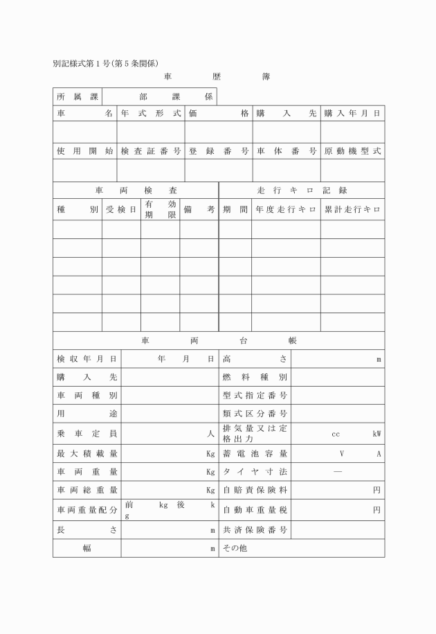 第5条 管理責任者又は整備管理者において公用車の購入、廃車等異動があったときは、その都度車歴簿(別記様式第1号)を作成しなければならない。