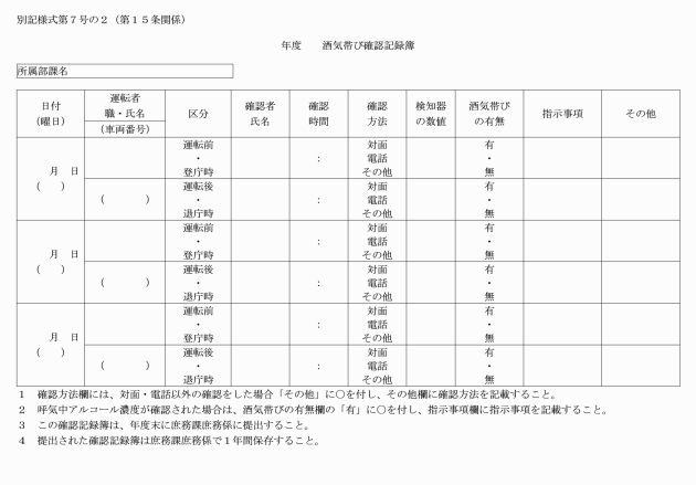 3 安全運転管理者は、公用車を運転する者に対し酒気帯び確認を行った結果を酒気帯び確認記録簿(別記様式第7号の2)により記録し、当該記録を1年間保存しなければならない。