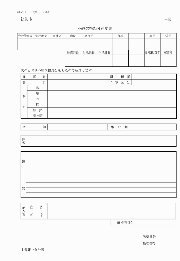 第23条 歳入調定者は、通知書等を発行するときは、発行年月日を記載し、市長印を押すものとする。この場合において、市長印は押印にかえて印影(縮小又は拡大したものを含む。)を印刷して行うことができる。