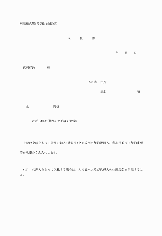 第1 一般競争入札又は指名競争入札に参加し、紋別市に物品を供給しようとする者(以下「入札者」という)は、この心得及び紋別市契約規則(昭和39年紋別市規則第13号)を守らなければならない。