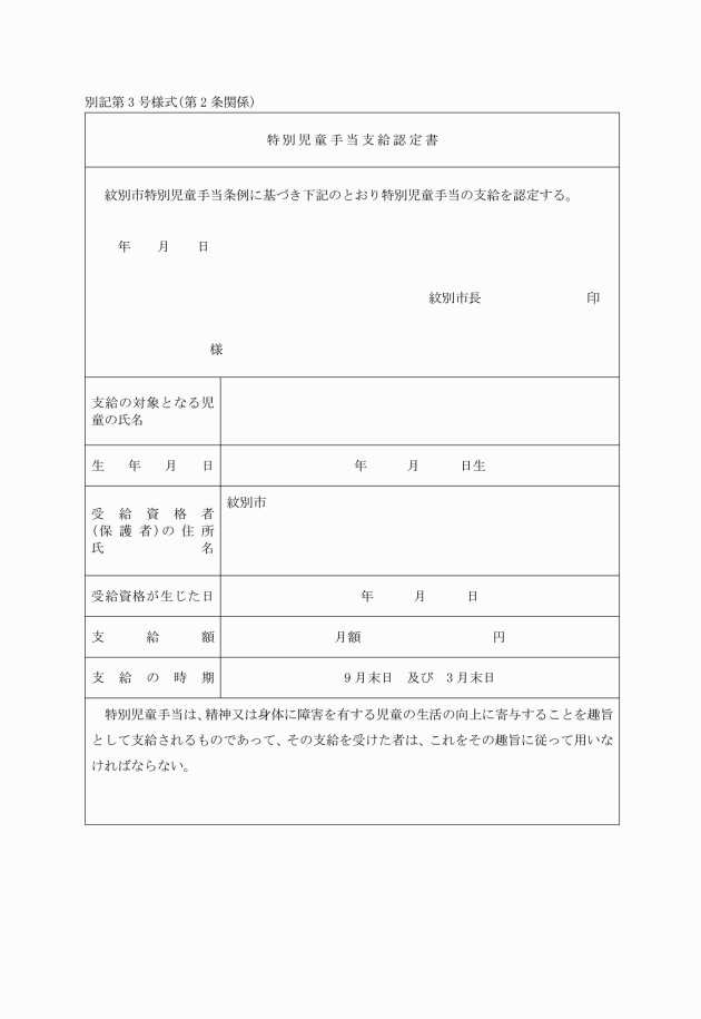 第1条 紋別市特別児童手当条例(昭和45年条例第10号。以下「条例」という。)第6条の規定によって特別児童手当(以下「手当」という。)の支給を受けようとするものは、特別児童手当支給認定申請書(別記第1号様式)によって市長に申請しなければならない。
