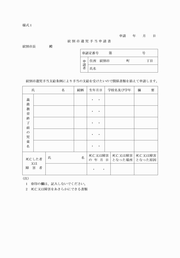 2 前項の届出のうち、児童数の変更に係る届出で児童数が増のときは、紋別市遺児手当申請書とともに認定に必要な書類を添えて市長に提出しなければならない。