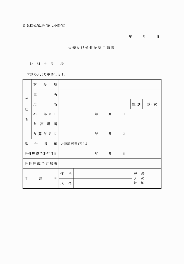 第13条 墓地、埋葬等に関する法律施行規則(昭和23年厚生省令第24号。以下「令」という。)第5条第3項において準用する同条第1項の規定による事実を証する書類の請求は、火葬及び分骨証明申請書(別記様式第3号)により行うものとする。