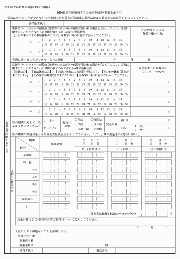 第23条の2 条例附則第2条の規定により傷病手当金の支給を受けようとする者は、国民健康保険傷病手当金申請書(別記様式第17号の2、別記様式第17号の3、別記様式第17号の4及び別記様式第17号の5)を市長に提出しなければならない。