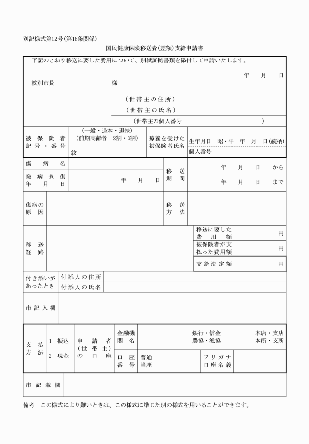 2 世帯主は、前項の申請に当たり、療養費、特別療養費及び移送費を受けようとする場合は、療養に要した費用に関する証拠書類その他必要な書類を、療養給付差額を受けようとする場合は、一部負担金又は実費を徴収した関係機関が発行した領収書をそれぞれ申請書に添えて、市長に提出しなければならない。