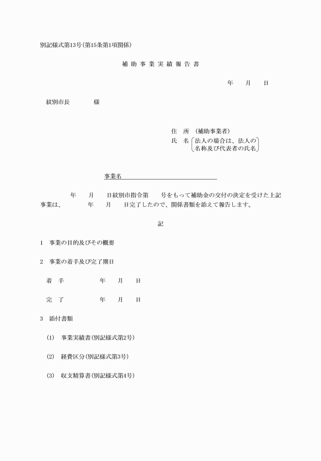 第15条 補助事業者は、補助事業が完了したとき(補助事業の廃止の承認を受けたときを含む。)は、速やかに補助事業実績報告書(別記様式第13号)を市長に提出しなければならない。