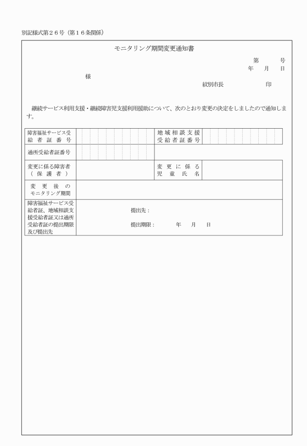 5 法第24条の26第1項第2号に規定する継続障害児支援利用援助の実施月を変更したときは、モニタリング期間変更通知書(別記様式第26号)を障害児相談支援対象保護者に通知するものとする。