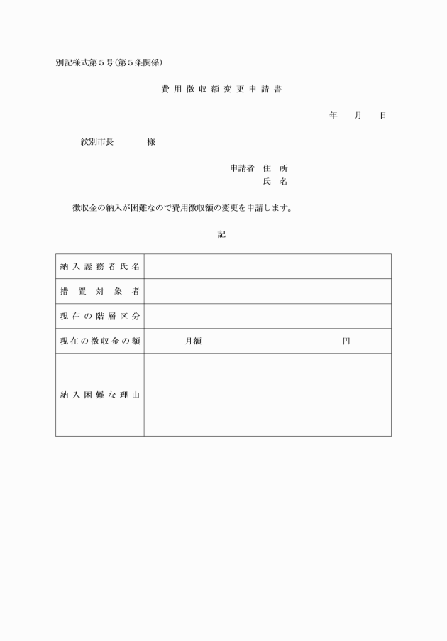 第5条 市長は、災害その他やむを得ない理由により前条に規定する費用の納入義務者の負担能力に変動が生じたと認められるときは、その変動の程度に応じて、納入義務者から徴収する費用の額を変更することができる。