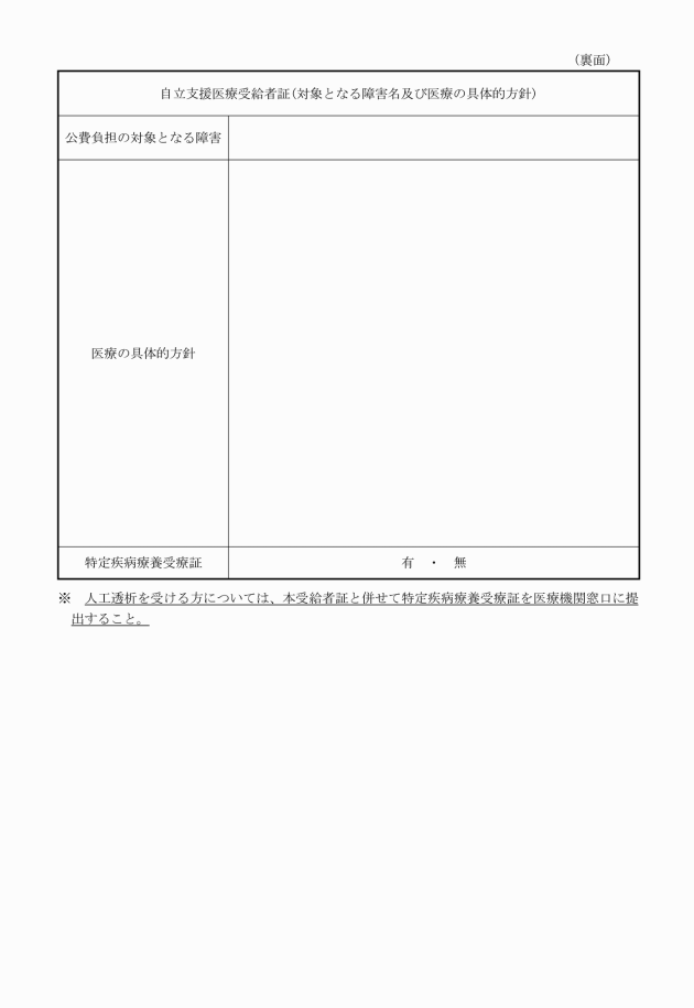 第22条の2 自立支援医療に係る治療用装具費の支給決定を受けようとする者は、自立支援医療(育成医療・更生医療)治療用装具費支給申請書(別記様式第30号の2)によるものとする。