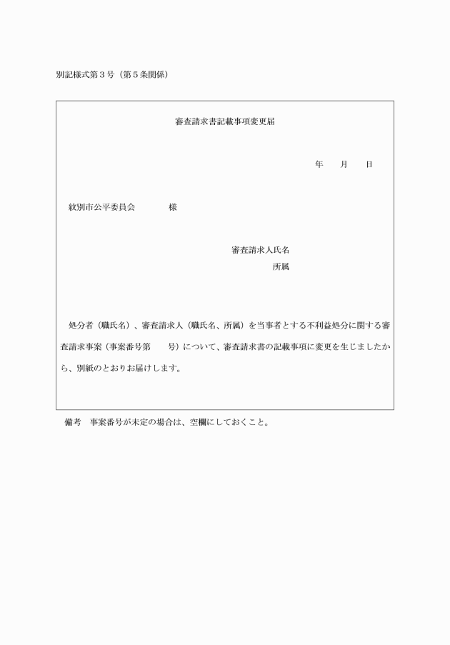 6 審査請求書の記載した事項に変更を生じた場合には、審査請求人は、その都度、審査請求書記載事項変更届(別記様式第3号)により、速やかに公平委員会に届け出なければならない。