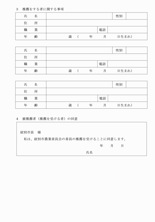 第5条 一般募集に応募をする者は、紋別市農業委員会の委員候補者応募申込書(別記様式第3号)を市長に提出するものとする。