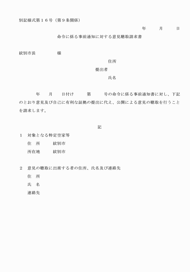 第10条 市長は、法第22条第7項の規定により意見聴取の期日及び場所を定めたときは、命令に係る事前通知に対する意見聴取の期日等の通知書(別記様式第17号)により通知するとともに、その旨を市の広報紙、市ホームページへの掲載等により公示するものとする。